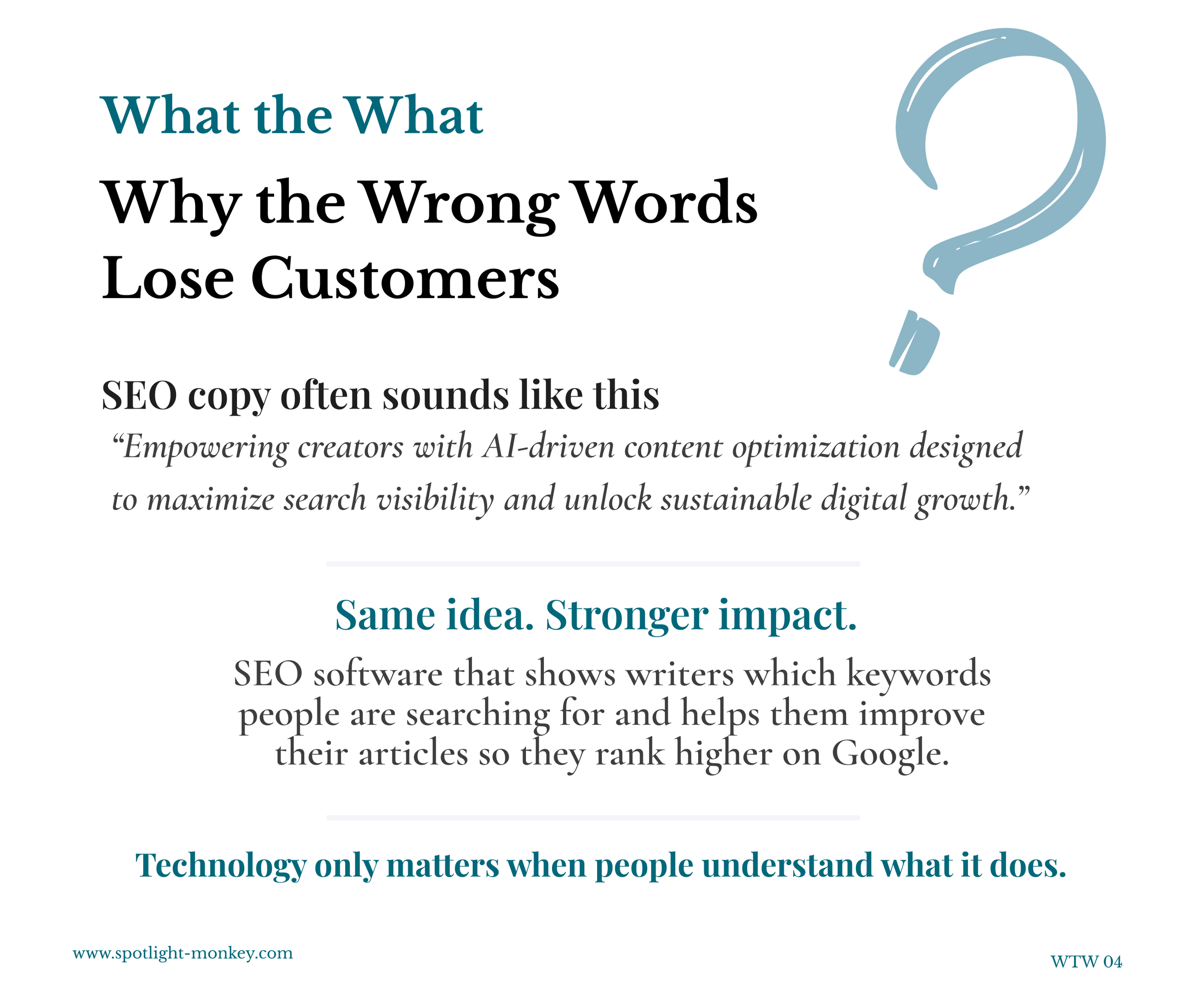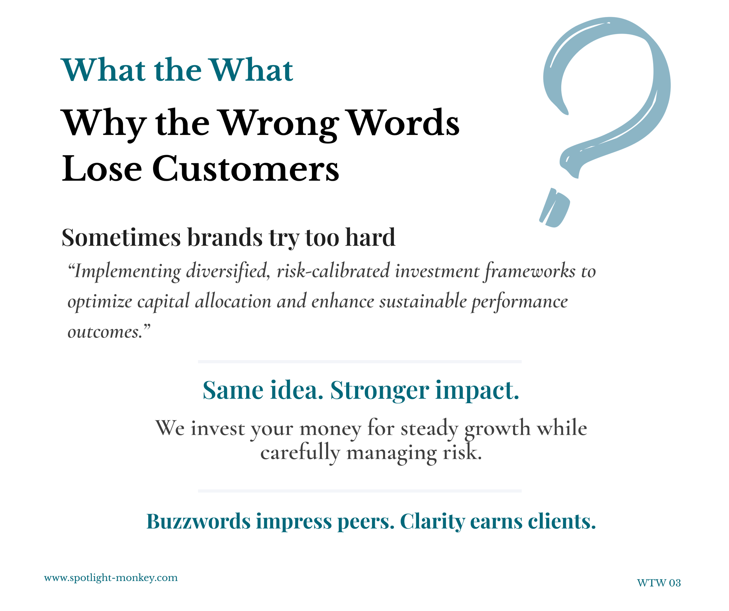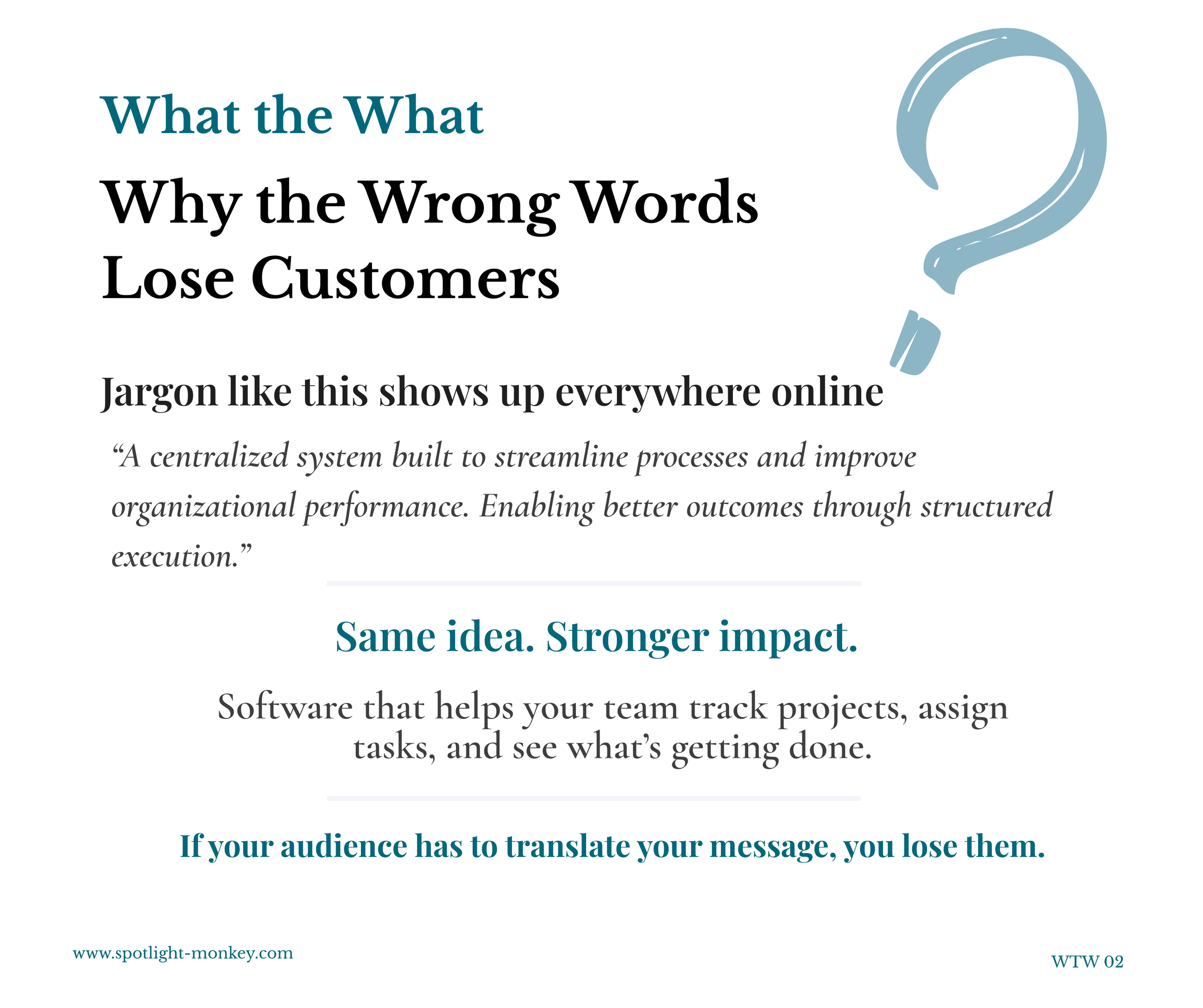 Below are examples from Spotlight Monkey’s WTW series which takes common alienating business language and turns it into messaging that humans can understand. Each example shows how a brand’s choice of words impact meaning for people.